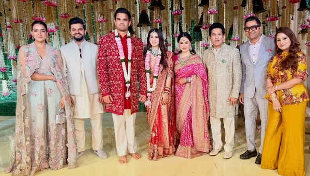 इस खास मौके पर सचिन तेंदुलकर और उनकी पत्नी Anjali Tendulkar भी मौजूद थे और वे नवविवाहित जोड़े के साथ गर्व से खड़े नजर आए। इसके अलावा अर्जुन की बहन Sara Tendulkar भी समारोह में शामिल हुईं। उन्होंने हल्के पेस्टल रंग का खूबसूरत लहंगा पहना था और परिवार के साथ इस खास पल को सेलिब्रेट करती दिखाई दीं।