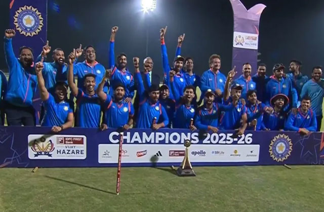 स्पोर्ट्स डेस्क : अथर्व तायडे के शानदार शतक और तेज़ गेंदबाज़ों के उम्दा प्रदर्शन की बदौलत विदर्भ ने सौराष्ट्र को 38 रन से हराकर विजय हजारे ट्रॉफी 2025-26 का खिताब अपने नाम कर लिया। यह डे-नाइट फाइनल मुकाबला बेंगलुरु स्थित बीसीसीआई सेंटर ऑफ एक्सीलेंस ग्राउंड-1 पर खेला गया।