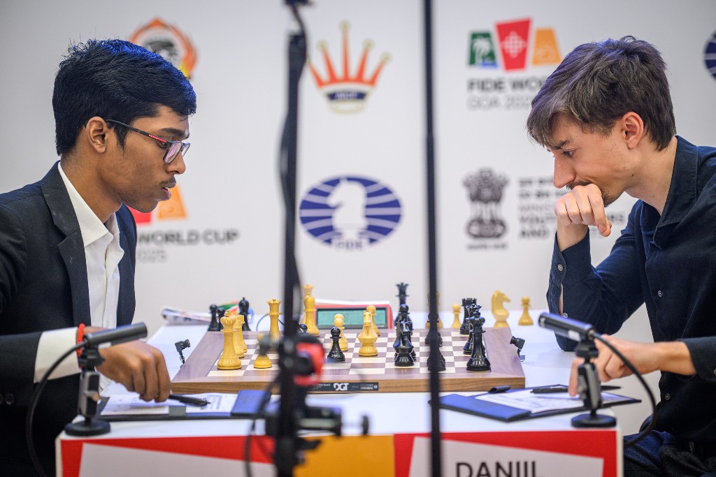 गोवा ( निकलेश जैन ) भारतीय ग्रैंडमास्टर्स के लिए मंगलवार का दिन राहत और रोमांच दोनों लेकर आया। फ़ीडे वर्ल्ड कप 2025 के चौथे दौर की पहली बाजी में भारत के आर. प्रज्ञानन्दा रूस के डेनियल डुबोव के खिलाफ एक समय हार की कगार पर पहुँच गए थे पर उन्हें एक बार फिर अपने विरोधी की कुछ ग़लत चालों का और ख़ुद की हर कीमत पर लड़ते रहने का फ़ायदा हुआ आवर मुश्किल स्थिति से ड्रॉ निकालकर प्रज्ञानंद नें अपनी उम्मीदें कायम रखीं है । वहीं भारत के अर्जुन एरिगैसी, कार्तिक वेंकटारमन , प्रणव वी और पी. हरिकृष्णा ने भी अपने-अपने मुकाबलों में केल मोहरो से खेलते हुए ड्रा खेला।