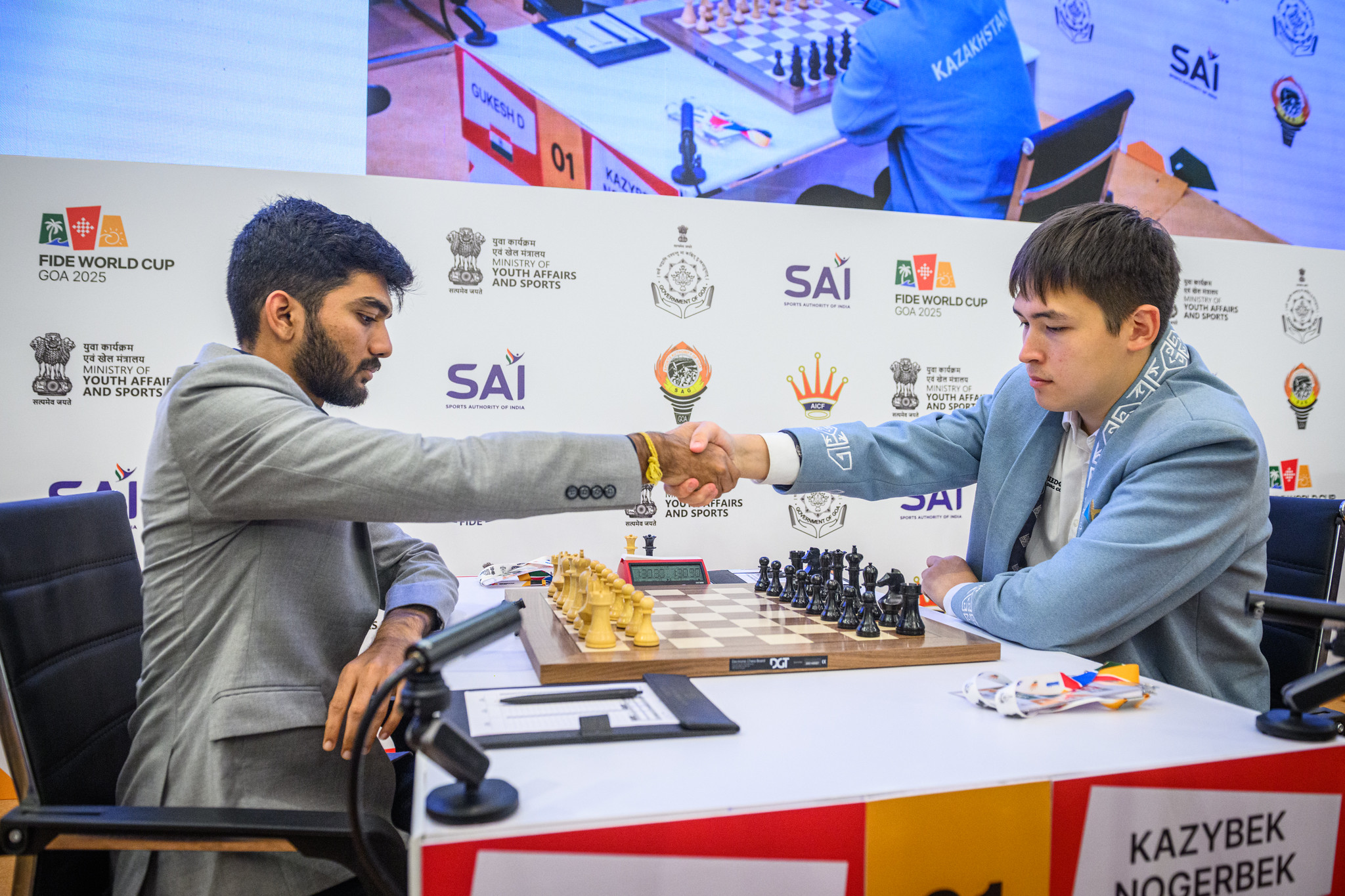 गोवा ( निकलेश जैन ) फीडे विश्व कप 2025 के दूसरे राउंड की पहली बाजी से सारे दिग्गज वरीय खिलाड़ी विश्व कप के अपने अभियान को आरंभ करते नजर आए, पहले बोर्ड पर विश्व चैम्पियन डी गुकेश और उज्बेकिस्तान के नोगेरबेक कायबेक की बाजी की पहली चाल चलकर उदघाटन करने के लिए खुद मेजबान गोवा के मुख्यमंत्री प्रमोद सावंत और पाँच बार के विश्व चैम्पियन विश्वनाथन आनंद पहुंचे ।