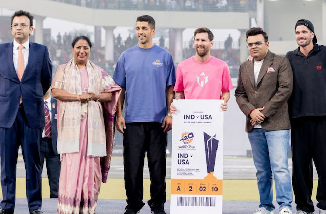 नई दिल्ली : अर्जेंटीना के फुटबॉल लिजेंड लियोनेल मेस्सी को GOAT इंडिया टूर के आखिरी पड़ाव पर यहां अरुण जेटली स्टेडियम में ICC चेयरमैन जय शाह ने इंडिया बनाम USA पुरुष T20 वर्ल्ड कप 2026 के टिकट दिए। इस इवेंट में दिल्ली की मुख्यमंत्री रेखा गुप्ता और DDCA अध्यक्ष रोहन जेटली भी मौजूद थे। मेस्सी को रोड्रिगो डी पॉल और लुइस सुआरेज के साथ एक फ्रेम किया हुआ क्रिकेट बैट और टीम इंडिया की जर्सी भी गिफ्ट की गई। पूर्व भारतीय गोलकीपर अदिति चौहान, जिन्होंने विमेंस प्रीमियर लीग में वेस्ट हैम यूनाइटेड का प्रतिनिधित्व किया था, ने तीनों मेहमानों को एक साइन की हुई टी-शर्ट गिफ्ट की।