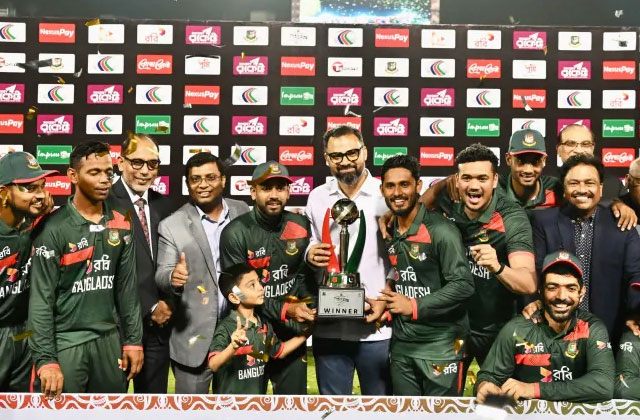 स्पोर्ट्स डेस्क : Bangladesh national cricket team ने शानदार प्रदर्शन करते हुए Pakistan national cricket team को तीसरे वनडे में 11 रन से हराकर सीरीज 2–1 से अपने नाम कर ली। मीरपुर में खेले गए इस निर्णायक मुकाबले में बांग्लादेश की जीत के हीरो रहे तंज़ीद हसन का शानदार शतक और तस्किन अहमद की घातक गेंदबाजी। इस जीत के साथ बांग्लादेश ने 11 साल बाद पाकिस्तान के खिलाफ द्विपक्षीय वनडे सीरीज जीतकर बड़ा रिकॉर्ड भी बना लिया।