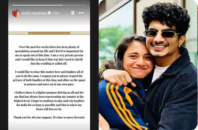 पिछले कुछ सप्ताह से सोशल मीडिया पर उनकी शादी को लेकर कई तरह की अटकलें लगाई जा रही थीं। इसी पर स्पष्टता लाते हुए मंधाना ने इंस्टाग्राम पर लिखा, 'मैं स्पष्ट करना चाहती हूं कि शादी रद्द कर दी गई है। कृपया इस मामले को यहीं समाप्त करें और हमें आगे बढ़ने के लिए जगह दें।'