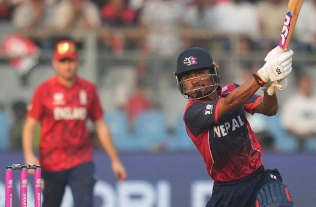 नेपाल को आखिरी तीन ओवर में 46 रन चाहिए थे तब बाम ने ताबड़तोड़ बल्लेबाजी की। उन्होंने जोफ्रा आर्चर के 18वें ओवर में दो छक्के और 19वें ओवर में ल्यूक वुड पर लगातार दो चौके लगाए। भुर्तेल ने शुरुआत में तेजी से रन जुटाए जबकि पौडेल और ऐरी के बीच तीसरे विकेट के लिए 82 रन की मजबूत साझेदारी ने नेपाल को मजबूती दी। नेपाल ने आसिफ शेख (07) के रूप में शुरुआती विकेट गंवा दिया था लेकिन भुर्तेल ने 17 गेंद में चार चौकों और एक छक्के की मदद से 29 रन बनाकर लय बनाई। लेकिन छठे ओवर में आउट हो गए।